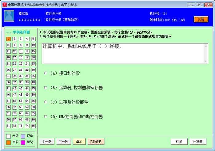 本系统依据全国计算机技术与软件专业技术资格考试《软件设计师》考试大纲研制而成。系统具有全真模拟、精选真题、详尽解析、自动评分等功能,系统中包含历次考试真题。系统分训练模式和考试模式两种练习方式,可更好地满足考生学习要求。欢迎全国软考考生下载使用。